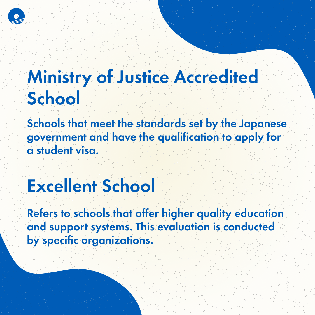 Để học tiếng Nhật tại Nhật Bản, bạn cần phải theo học tại một “trường được Bộ Tư pháp cấp phép”. Đây là những trường đáp ứng các tiêu chuẩn do chính phủ Nhật Bản đặt ra và có đủ tư cách để xin visa du học sinh. Mặt khác, “trường ưu tú” (Yuryokou) là những trường cung cấp chất lượng giáo dục và hệ thống hỗ trợ thậm chí còn cao hơn, và sự đánh giá này được thực hiện bởi các tổ chức cụ thể. Nói cách khác, khi chọn trường tiếng Nhật, bạn nên tham khảo xem trường đó có được chính phủ cấp phép hay không, đồng thời cũng nên tham khảo đánh giá “trường ưu tú” để biết chất lượng giáo dục và sự hỗ trợ có tốt không.