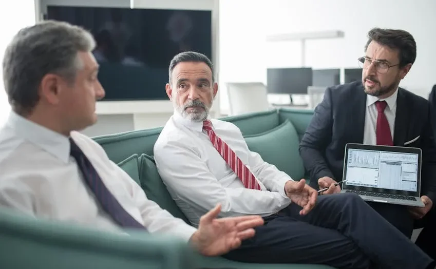 [Image of Two business people discussing with serious expressions]